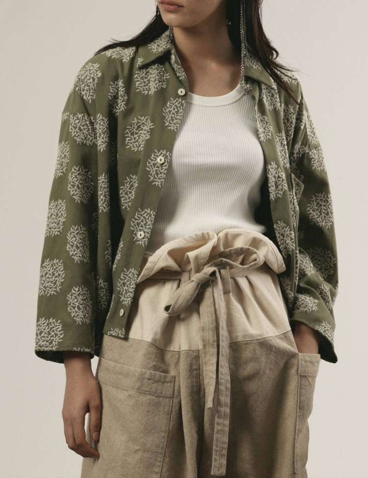 'THAI MASSAGE PANTS' and 'VINTAGE WORK JACKET' are suggested as a matching set. These are 'THAI MASSAGE PANTS' offering a wide range of silhouettes on a box-shaped wide pattern and adjustable waist. By pairing the thick vintage gabardine fabric from Japan's 'KOYAMA' with soft 10'S washable cotton at the waist, it has a heavy and luxurious feel but is comfortable to wear. This item is a modern revisit of the classic Southeast Asian attire and is typically tied with a bold strap.