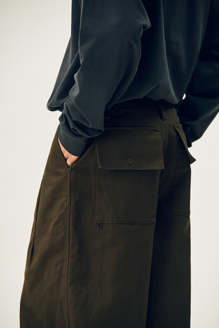 견고함을 기반으로 가장 보편적인 움직임과 편의성에 불편함이 없도록 집중한 제품으로 이번 시즌은 'VANCET'사의 10oz 두께감의 코튼 헤비트윌 원단을 채택, FW시즌성에 충실하였으며 앞판에 큼지막한 플랩형태의 지퍼 플라이가 상징적인 디자인으로 사이드 슬릿포켓과 뒤편에 위치한 와이드 아웃패치 포켓, 우측 허벅지