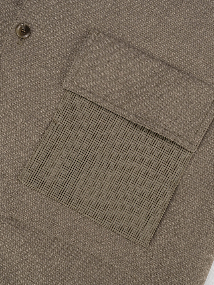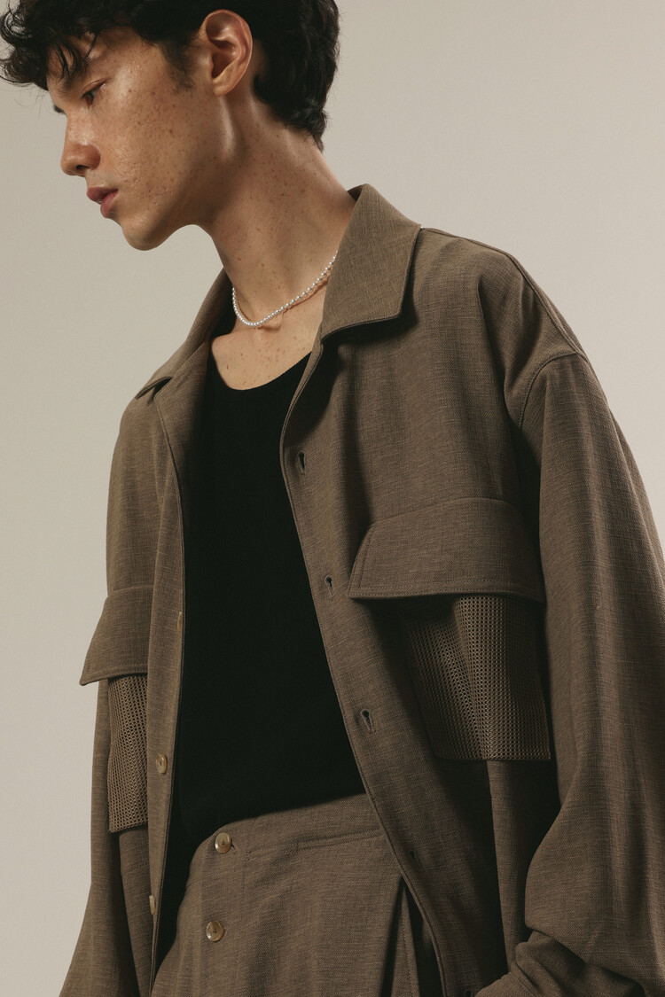 편안한 활동성과 기능적 구성을 모티브로 기획된 '4POCKET SKIRT JACKET' 입니다. 일본 'TORAY'사의 폴리 리사이클 샴브레이 원단을 활용하여 경쾌한 착용감과 청량감을 높혔으며, 정재된 실루엣은 과도하지 않으면서 멋스러운 스타일링을 제안합니다. 시즌성이 강조된 MESH원단을 디테일적 요소로 채택하고, 가슴에 2개의 플랩포켓과 사이드포켓까지 총 4군데의 수납을 통하여 보다 다양항 수납의 공간을 구성하고 있습니다.