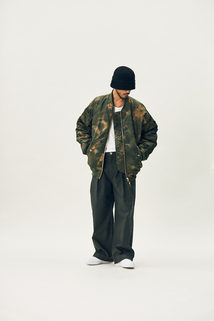 A new silhouette introduced this season, the "MERELY WIDE TUCK PANTS” provides a wide and casual yet elegant silhouette. The 10 OZ cotton heavy bit will fabric of "VANCET" Japan is heavy and stylish and the pants include side slit pockets of decent size. More storage is ensured from the rear-welt pocket and the sunglasses pocket located at the bottom of the right thigh, conveniently located for optimal stability to the overall silhouette. MERELY WIDE SLACKS PANTS offers a wide tuck that falls from the front tip to the center of the thigh ensuring a comfortable stance with room for comfort.