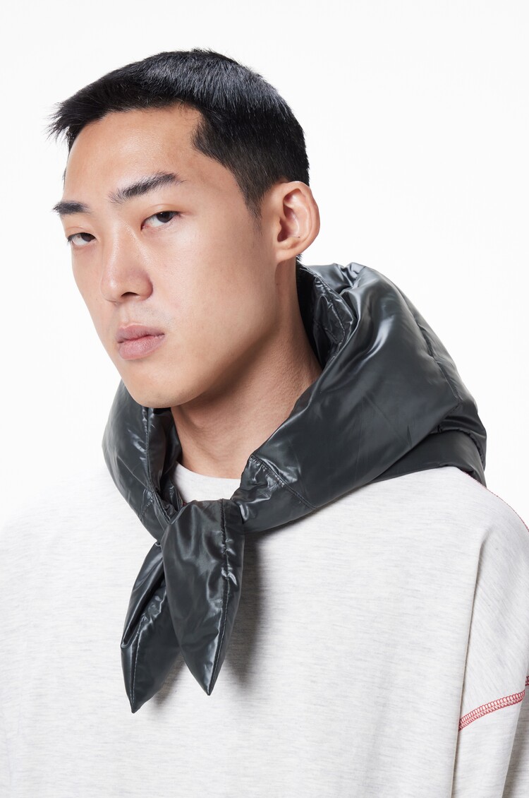 23FW 시즌부터 첫 선을 보이는 의류 악세서리 라인의 첫번째 제품인 'MERELY GOOSE-DOWN HOOD SCARF' 입니다. 일본 'MASUDA'사의 은은한 광택감이 고급스러운 'NANO SOLID' 나일론 원단과 80:20 프리미엄 구스다운 충전재를 적용하여 가벼운 중량감과 볼륨감을 극대화 하였으며, 급변하는 날씨를 대비하고 포인트 레이어링에 초점을 맞춘 악세서리 아이탬으로 매듭형태로 연출되는 스카프 디테일이 이색적인 제품입니다.