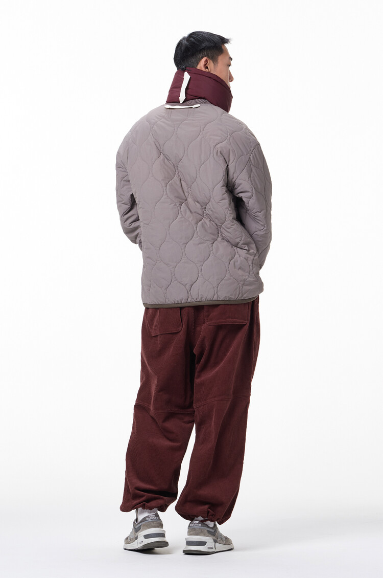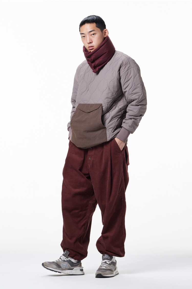 This is 'MERELY GOOSE-DOWN NECK WARMER', the second product of the 23FW season clothing accessory line. This neck warmer-shaped accessory is made with 80:20 premium goose down filling to maximize light weight and volume. Its small size makes it easy to carry, and it is designed with sun grip snap buttons for light fastening and an E-STRING for size adjustment at the neck entrance to allow options to suit the weather and user's preference.