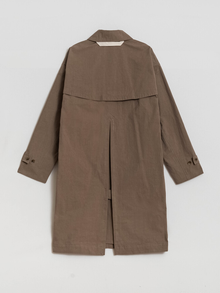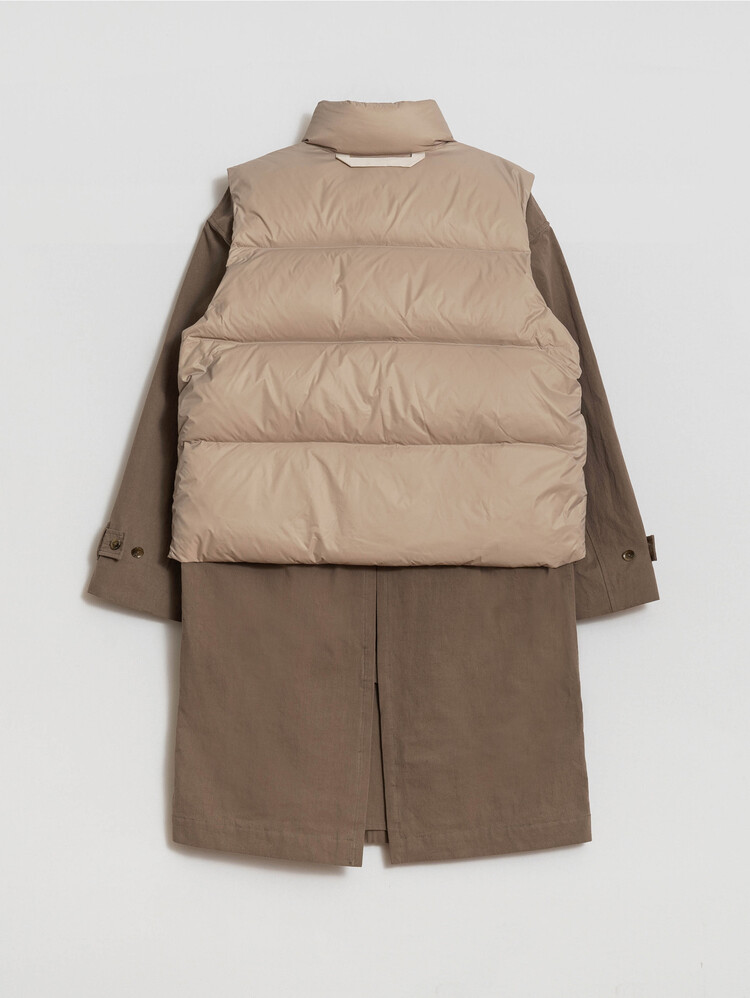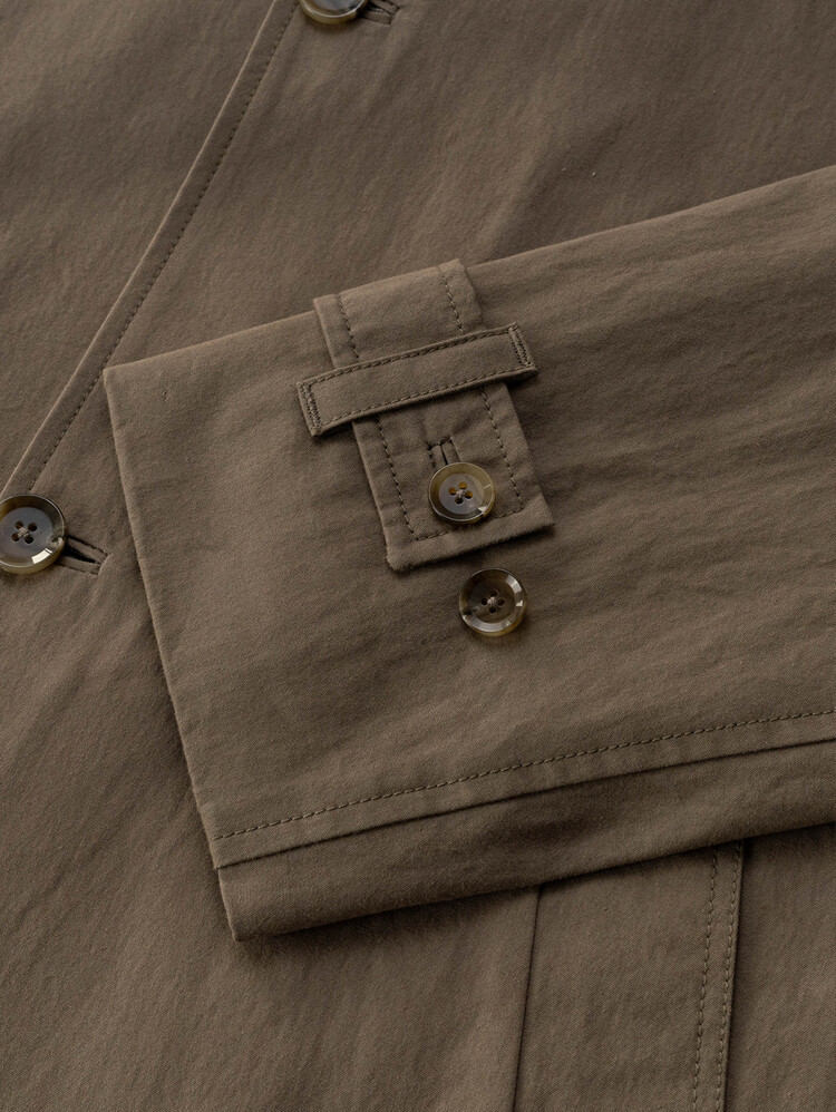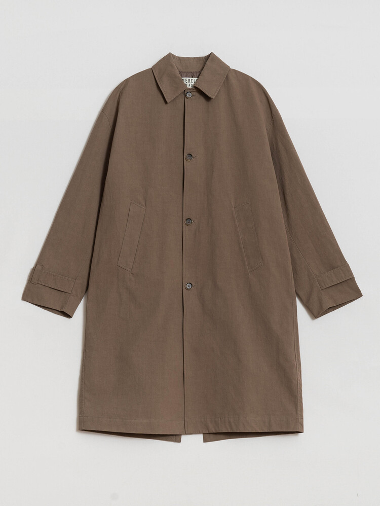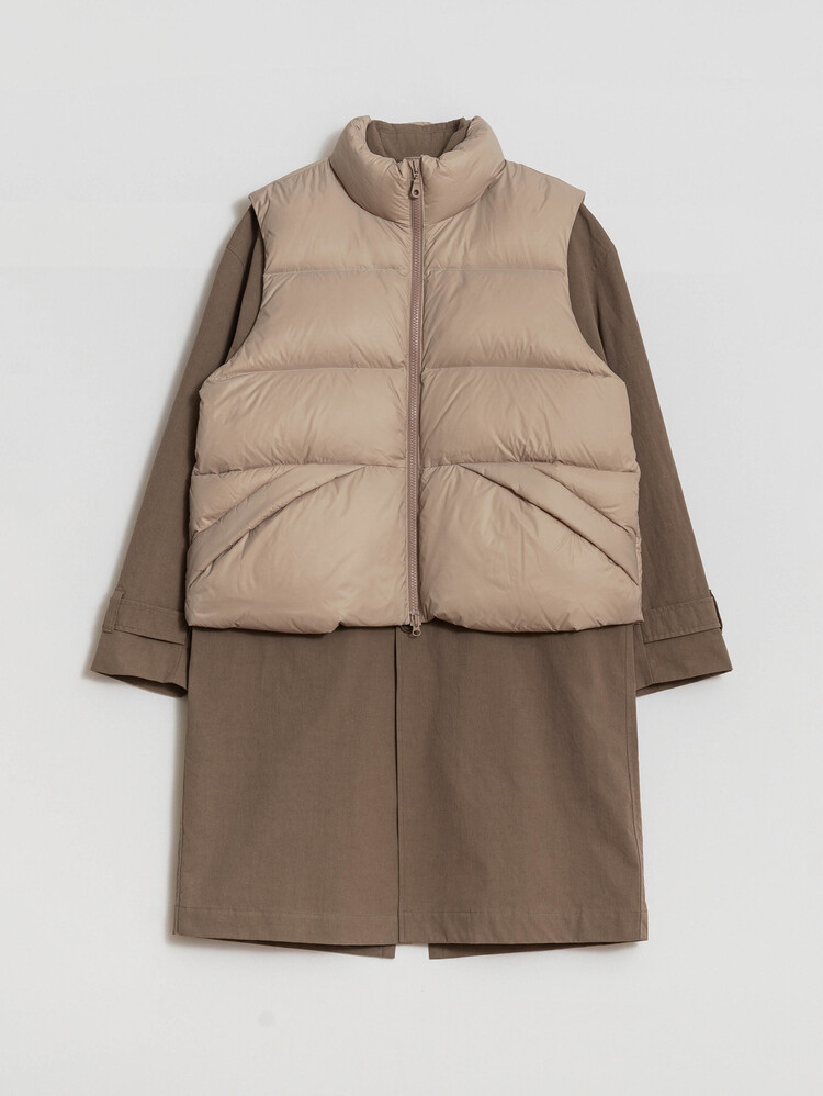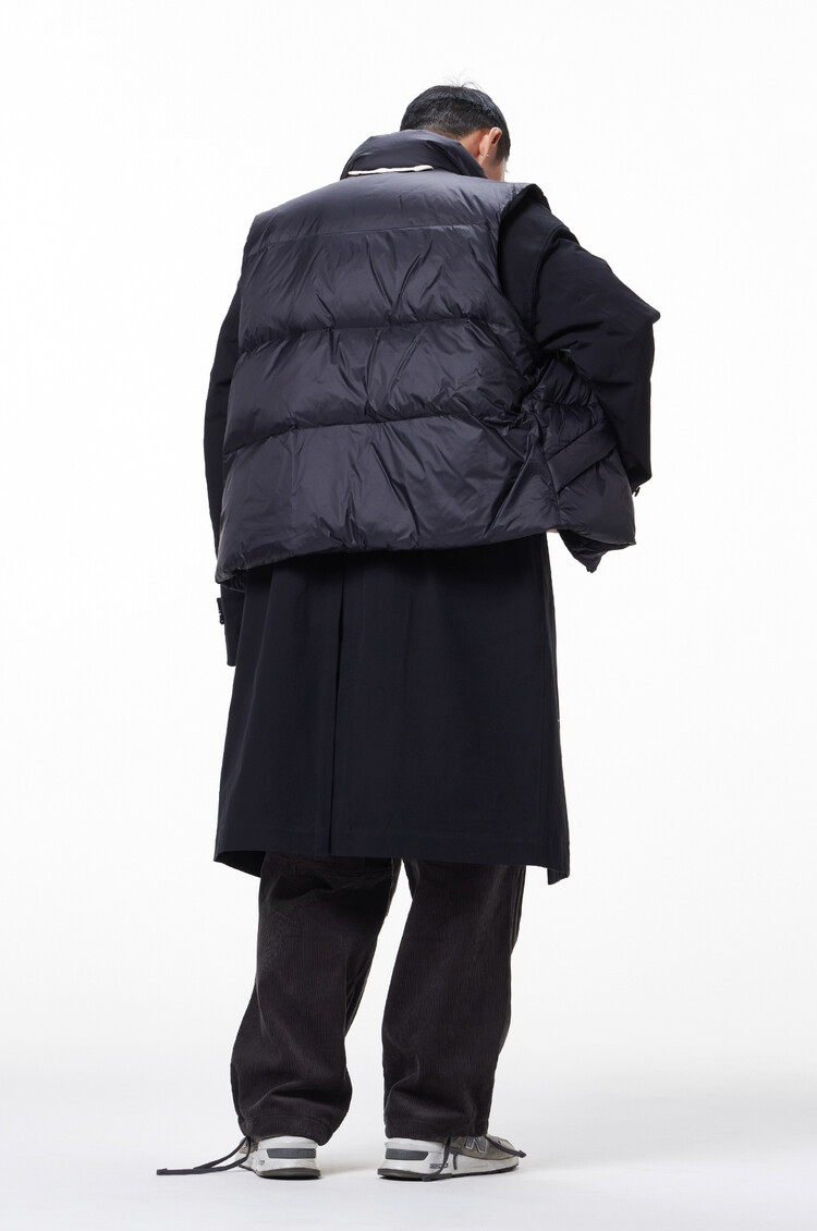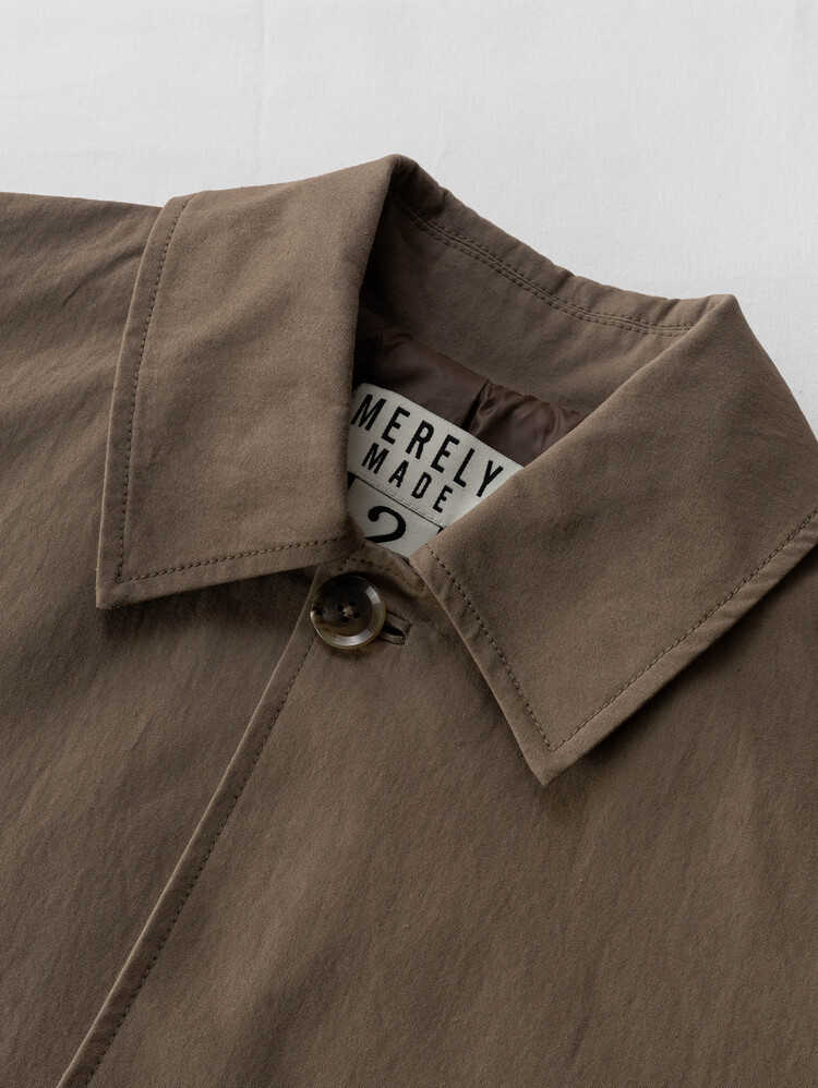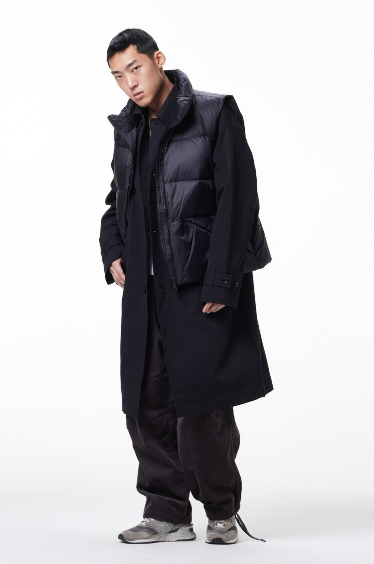 'MERELY PREMIUM GURKHA DUAL-MODE COAT,' a versatile masterpiece that has undergone three generations of refinement since its debut in the 21FW season. The trench coat, crafted from robust vintage canvas sourced from Japan's renowned 'SHIBAYA,' presents a detachable design for two garments in one. This detachable feature offers various styles. The wide and elegant silhouette iconic of Merely Made's trench, has discreet welted side pockets and an extended ventilation detail at the lower center. The vest brings a sense of volume equivalent to a FILL POWER of 600. With a keen focus on functionality, it offers multiple storage options and convenience, thanks to the inclusion of YKK's cutting-edge nylon No. 8 2WAY front zipper.
