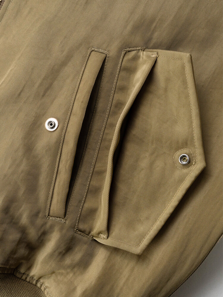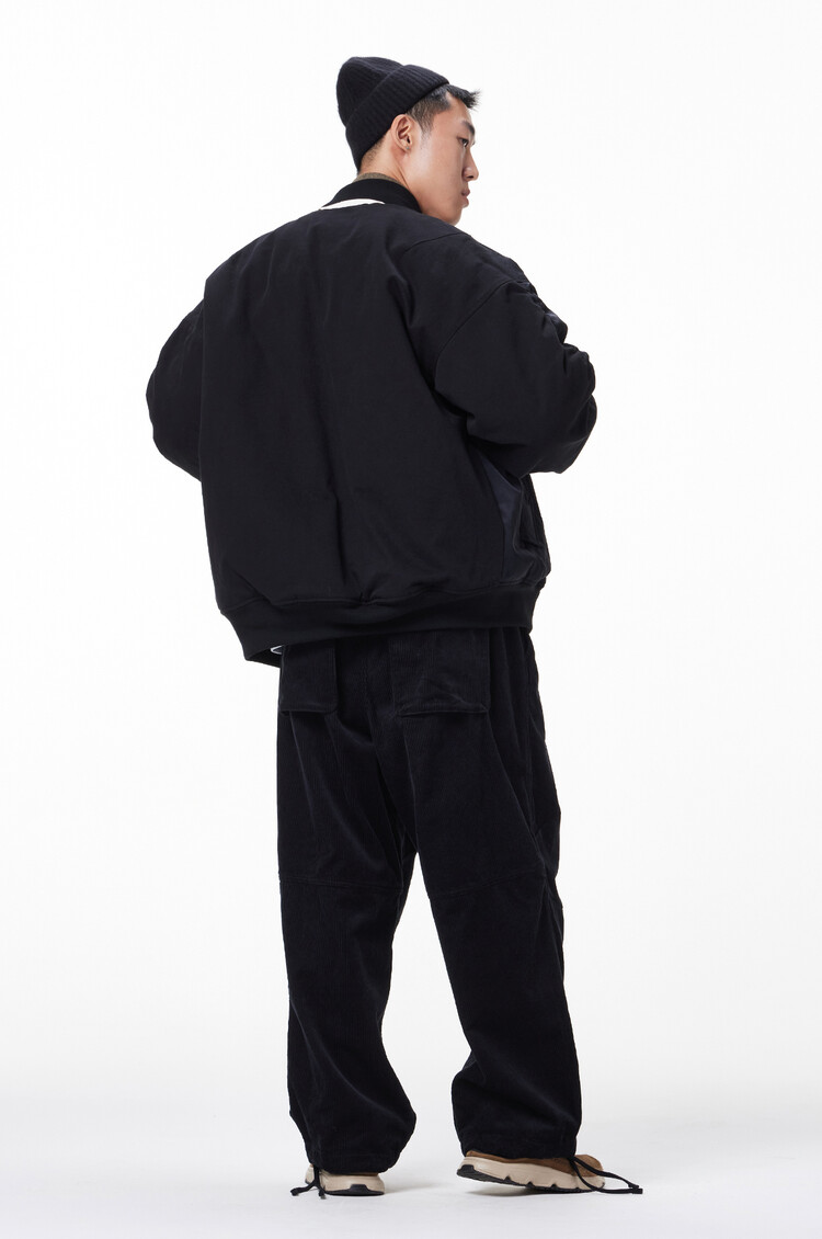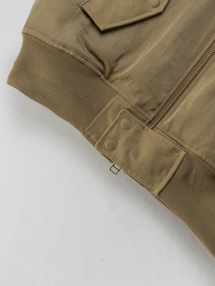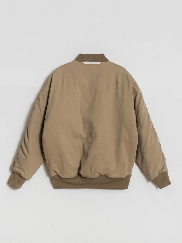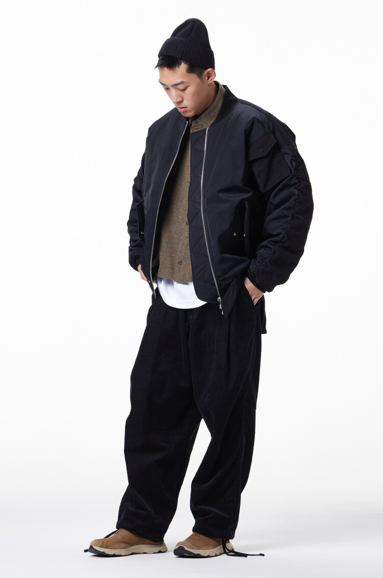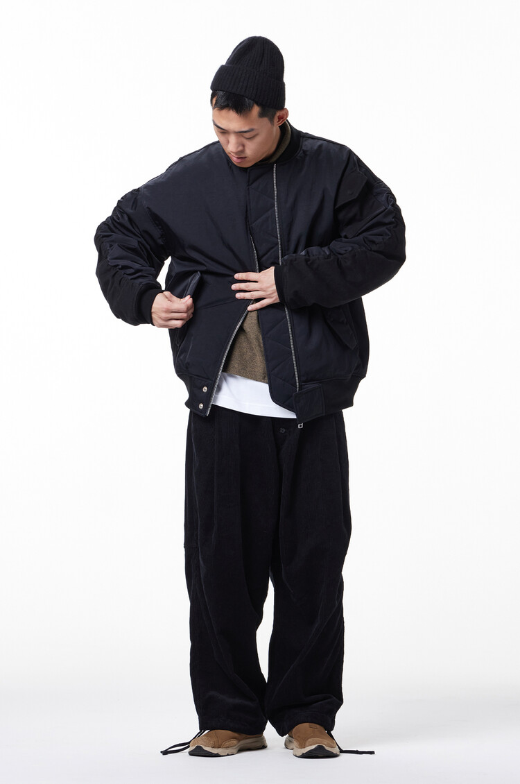 'MERELY PREMIUM VINTAGE MA-1 JUMPER,' now in its 2nd version this Fall. This garment combines the contrasting materials of nylon and cotton twill fabric for a unique blend of textures and a visually appealing look. We've put together the vintage heavy nylon twill fabric from Japan's 'KUWAMURA' with the robust 10'S heavy cotton twill from 'MASUDA.' In terms of design, we've taken inspiration from the classic MA-1 bomber jacket silhouette, making subtle changes. These details add a playful element to the overall design, a statement jacket in your wardrobe.