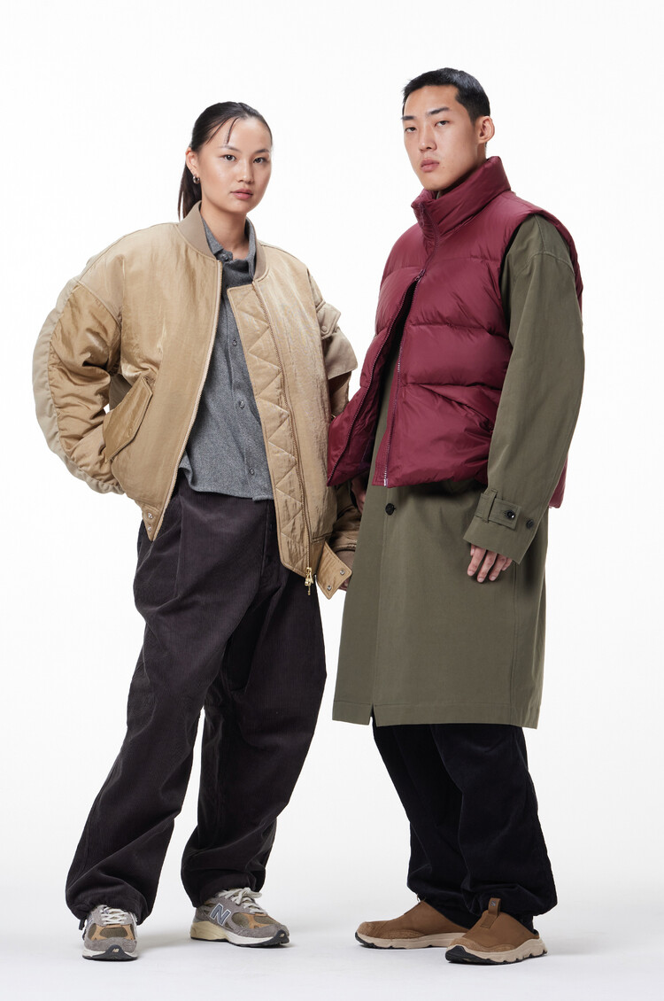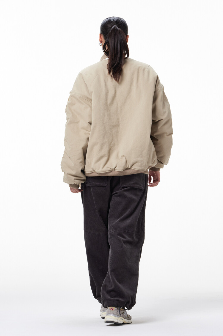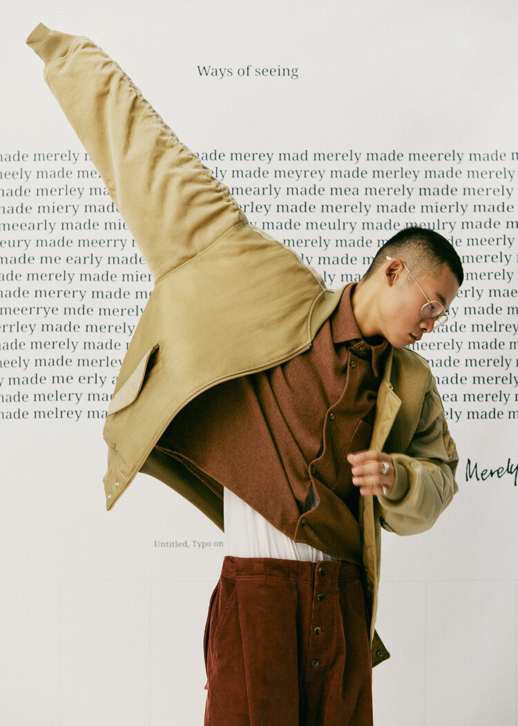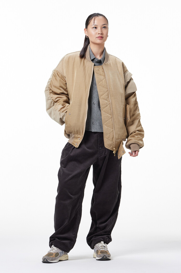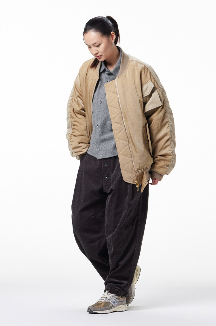'MERELY PREMIUM VINTAGE MA-1 JUMPER,' now in its 2nd version this Fall. This garment combines the contrasting materials of nylon and cotton twill fabric for a unique blend of textures and a visually appealing look. We've put together the vintage heavy nylon twill fabric from Japan's 'KUWAMURA' with the robust 10'S heavy cotton twill from 'MASUDA.' In terms of design, we've taken inspiration from the classic MA-1 bomber jacket silhouette, making subtle changes. These details add a playful element to the overall design, a statement jacket in your wardrobe.