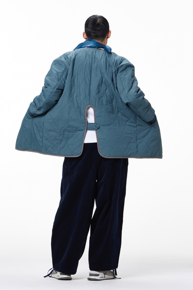 The 'MERELY QUILTED LINER JACKET,' made of classic nylon ripstop fabric from Japan's renowned 'MATSUDA,' coupled with quilting material filled with 3M THINSULATE for optimal insulation. It features a mid-length cut that gently covers the hip line, for a perfect fit and warmth. The inclusion of an arch-shaped fixed ventilation system at the rear end, combined with casual flap pocket details, ensures both comfort and practicality. Furthermore, its thoughtful design extends its utility as outerwear, making it a highly versatile addition to your wardrobe, suitable for various occasions and moods.