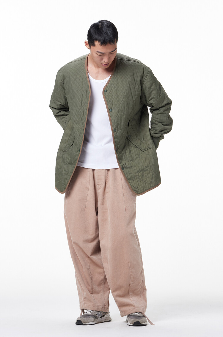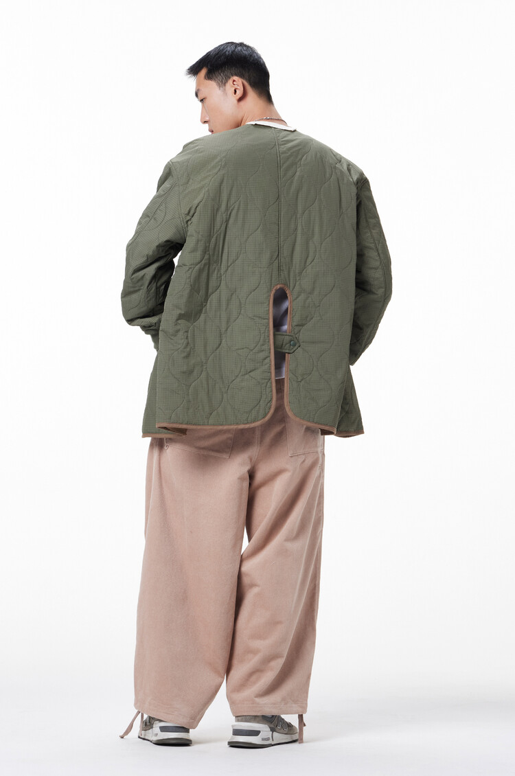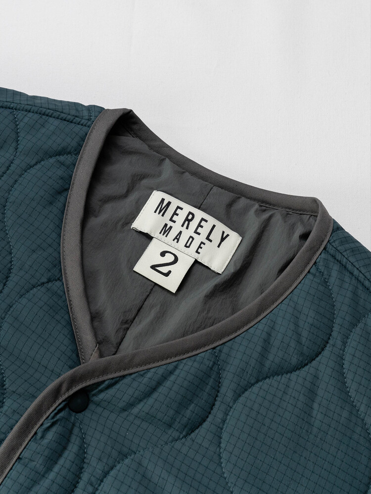 The 'MERELY QUILTED LINER JACKET,' made of classic nylon ripstop fabric from Japan's renowned 'MATSUDA,' coupled with quilting material filled with 3M THINSULATE for optimal insulation. It features a mid-length cut that gently covers the hip line, for a perfect fit and warmth. The inclusion of an arch-shaped fixed ventilation system at the rear end, combined with casual flap pocket details, ensures both comfort and practicality. Furthermore, its thoughtful design extends its utility as outerwear, making it a highly versatile addition to your wardrobe, suitable for various occasions and moods.