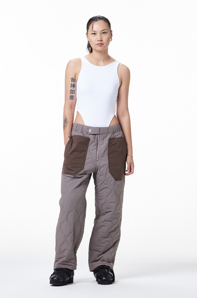 Introducing the 'MERELY QUILTED WIND STOPPER PANTS,' an improved version of the popular 'HUARAZ TREKKING PANTS' from the 20FW season. These pants feature a wide silhouette and refined details for an elevated aesthetic. Crafted with padding fabric and filled with 3M THINSULATE material, these pants excel in providing exceptional windproofing and warmth. They showcase a total of four concealed patch pockets, meticulously matched in tone-on-tone colors, and a tab-shaped obi detail that contributes to a harmonious design. Designed to complement the 'MERELY QUILTED WIND STOPPER SWEATSHIRT' as a MATCHING SET item, these pants are available in two color options: ZAMBEZI and BLACK.
