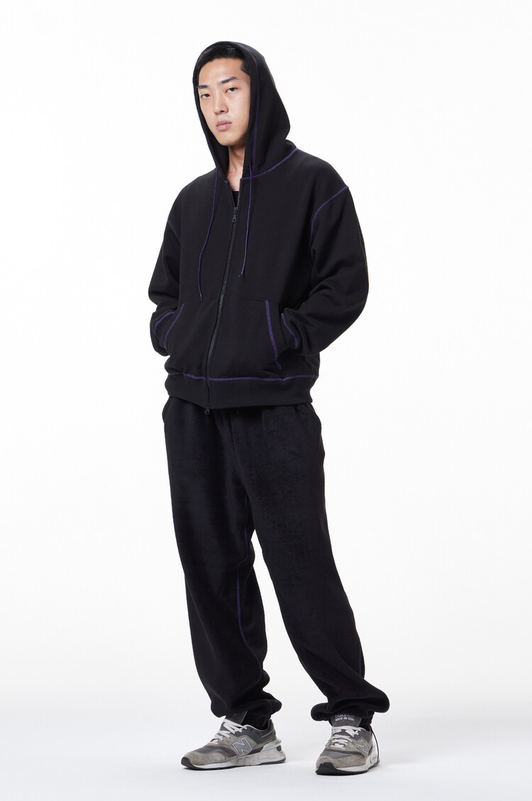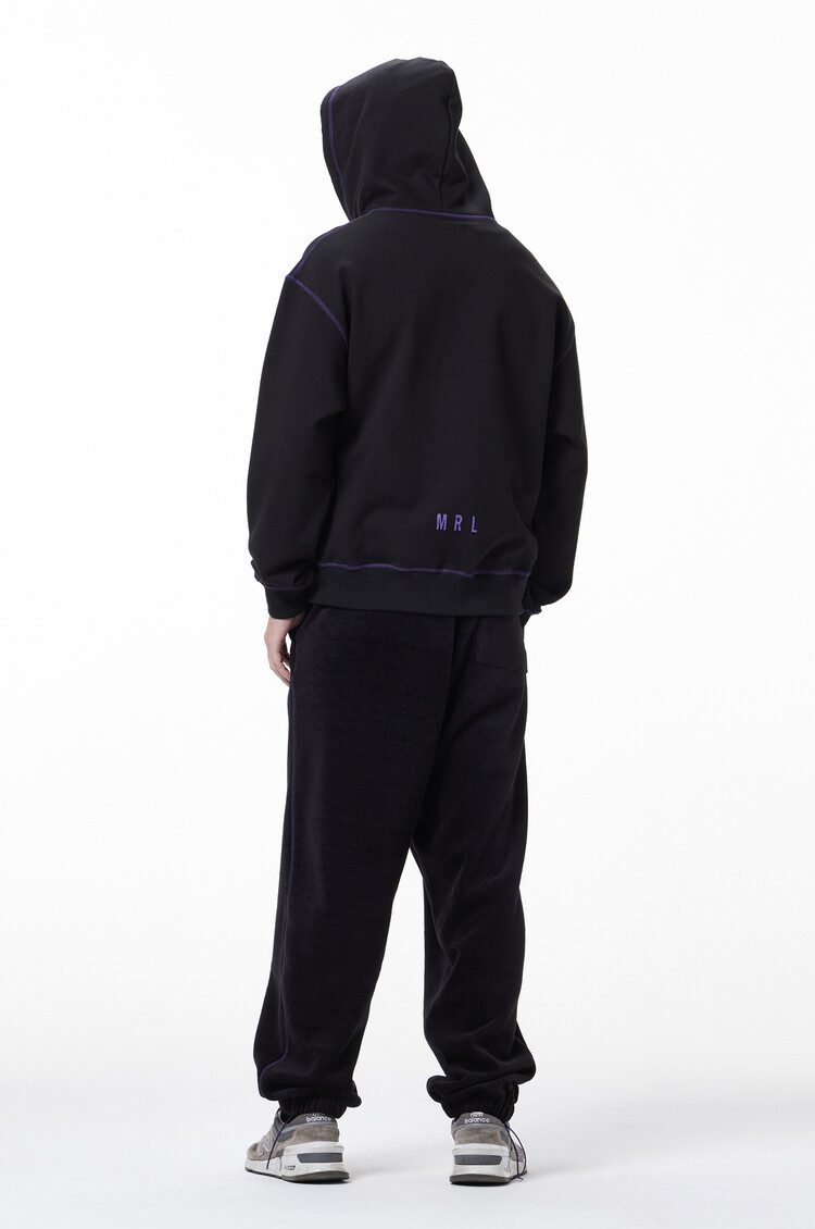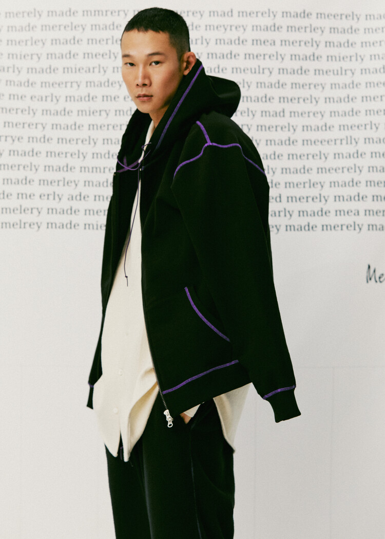 'MERELY SNUG OVER SIZE ZIP-UP HOODIE' is a fresh update to the classic Merely hoodie with a zip-up design. This hoodie features distinctive sewing details, with three stitches in a contrasting color, and a YKK 2WAY Vislon zipper, adding visual interest and practicality to the design. Furthermore, the generously sized hood and front kangaroo pocket provide ample storage and enhanced thermal insulation, functional and fashionable.