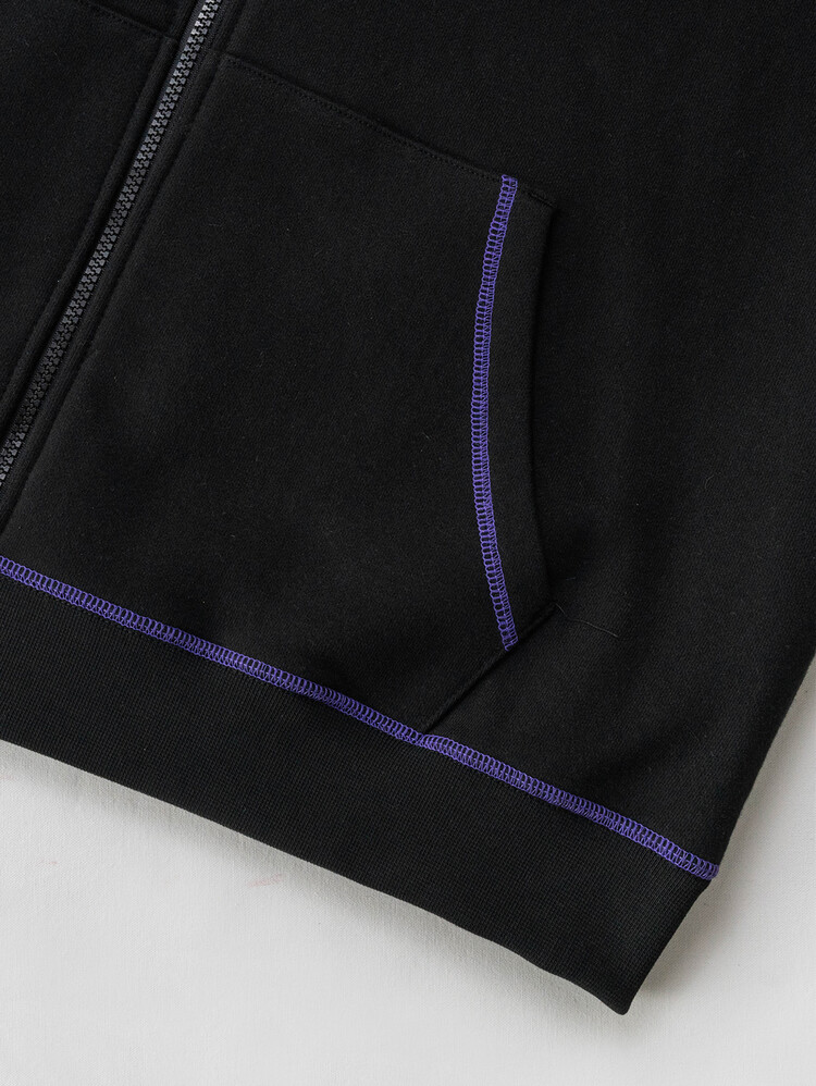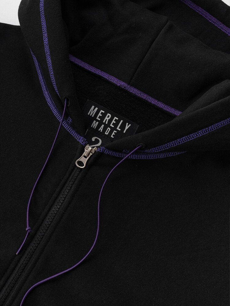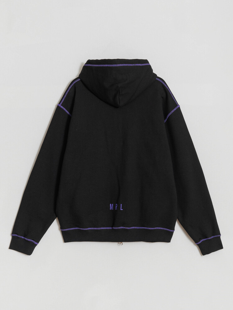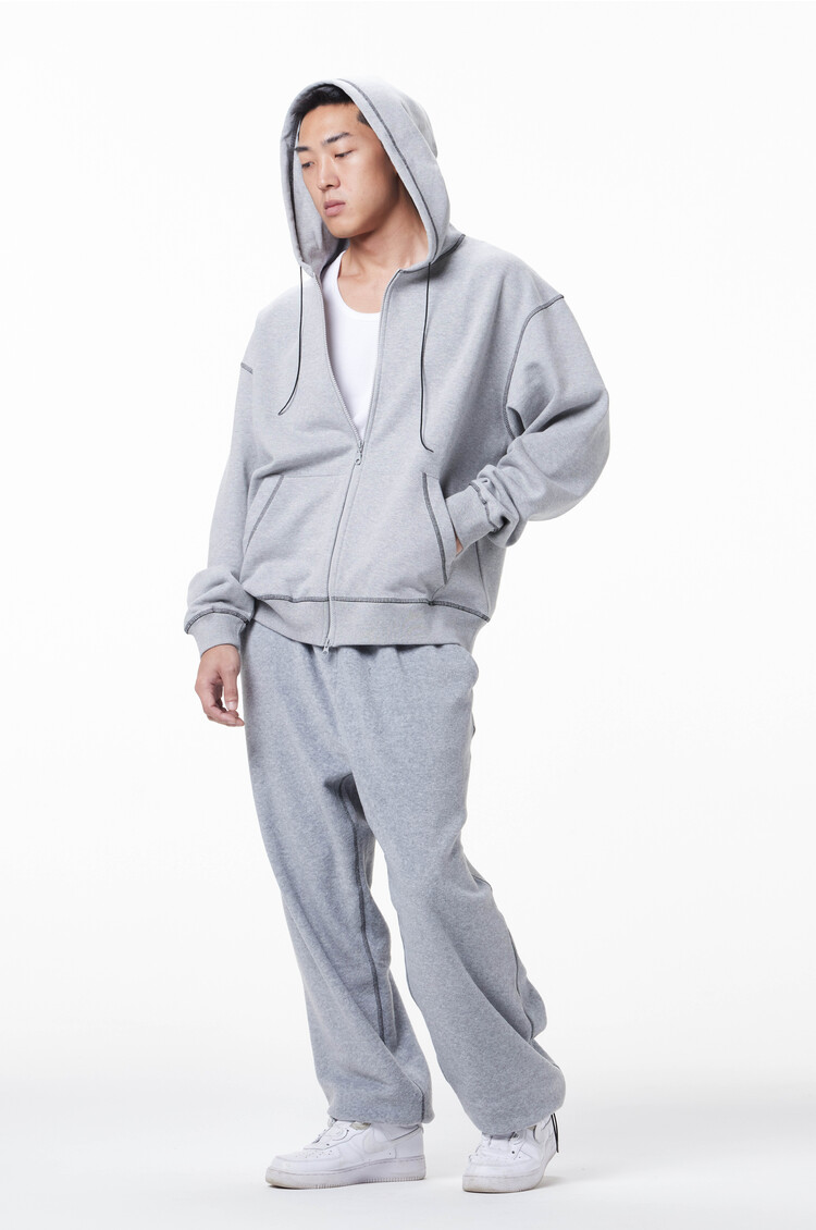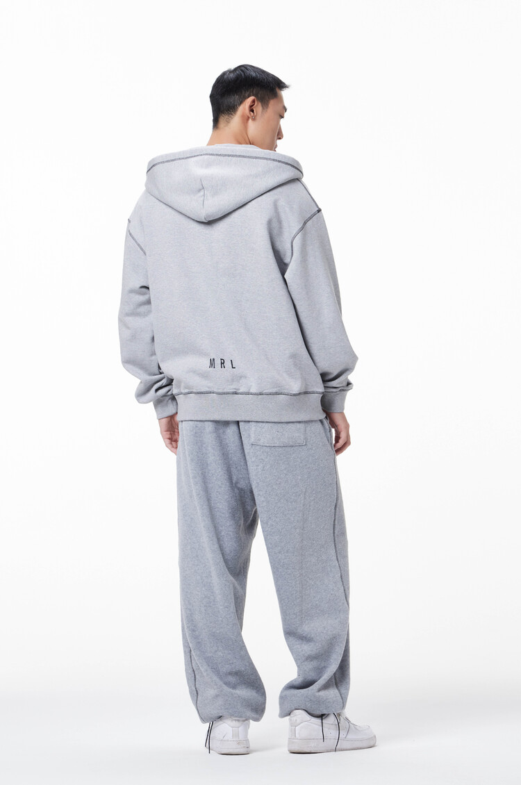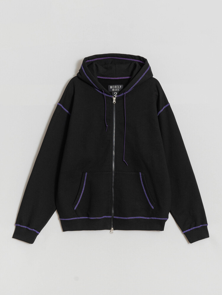 'MERELY SNUG OVER SIZE ZIP-UP HOODIE' is a fresh update to the classic Merely hoodie with a zip-up design. This hoodie features distinctive sewing details, with three stitches in a contrasting color, and a YKK 2WAY Vislon zipper, adding visual interest and practicality to the design. Furthermore, the generously sized hood and front kangaroo pocket provide ample storage and enhanced thermal insulation, functional and fashionable.