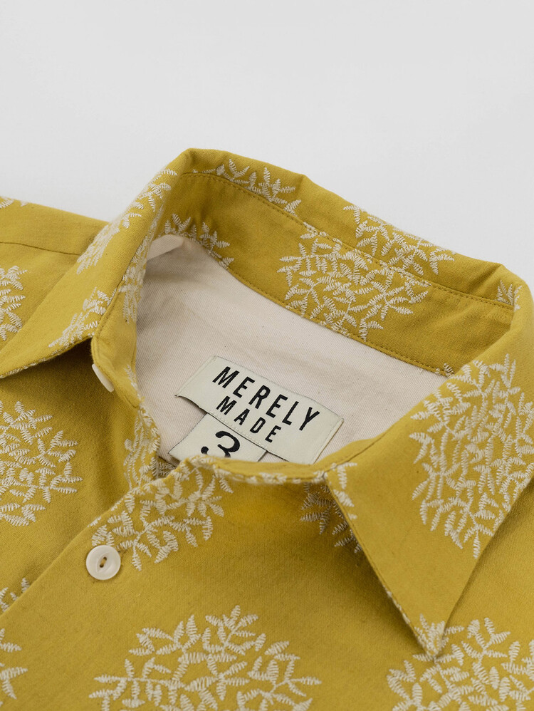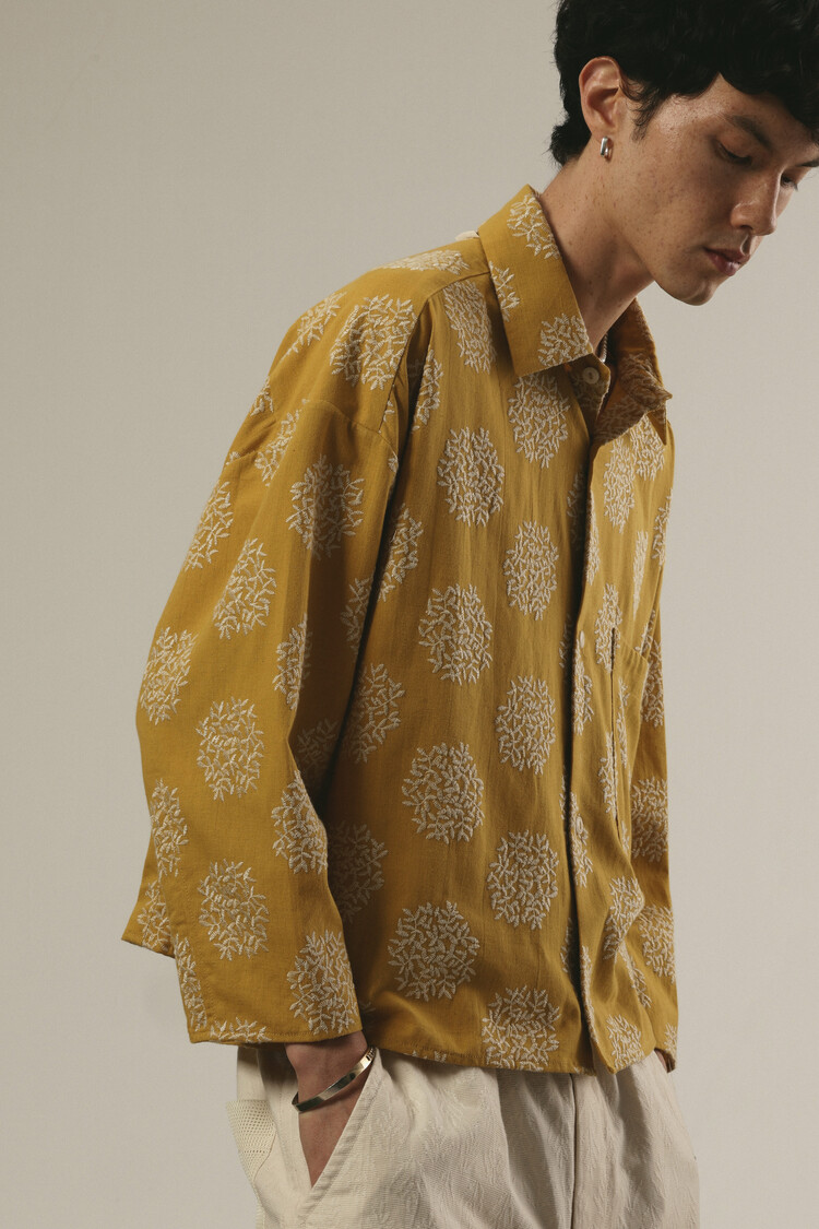 Our famous 'MERELY CROPPED SHIRT' is reinterpreted this season as 'MERELY FLOWER EMBROIDERY CROPPED SHIRT' for the fifth edition. Adopting a fabric with a luxurious flower embroidery pattern this time, the cropped shirt remains our best seller every season. It has three-dimensional 3D darts applied to the sleeves giving it this cropped yet wide and boxy fit.