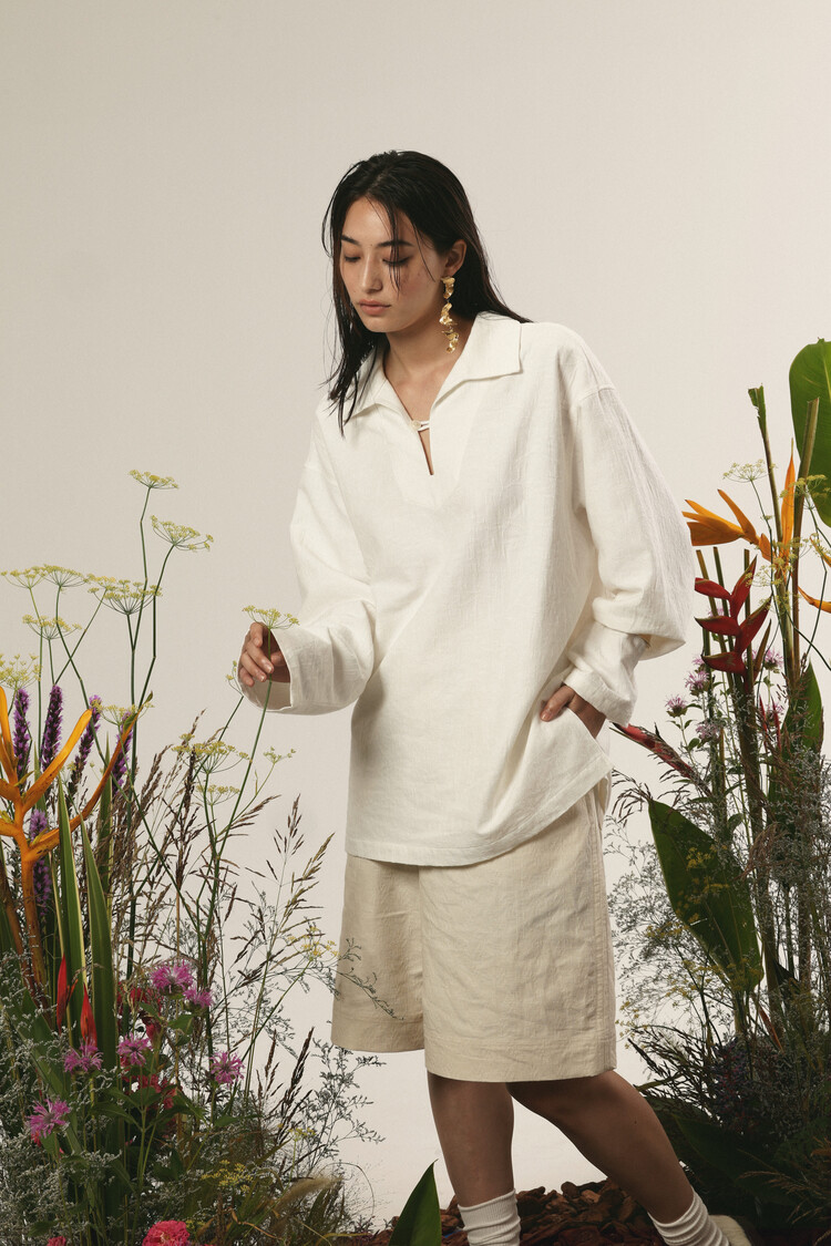 Introducing the 'FLOWER JACQUARD MARINER SHIRT'. Japan's 'SUNWELL' PLANT JACQUARD fabric expresses a subtle plant texture on a plain body, giving it a sense of liveliness and subtle details. It has a wide marine collar, a half-open placket, and side vent details.