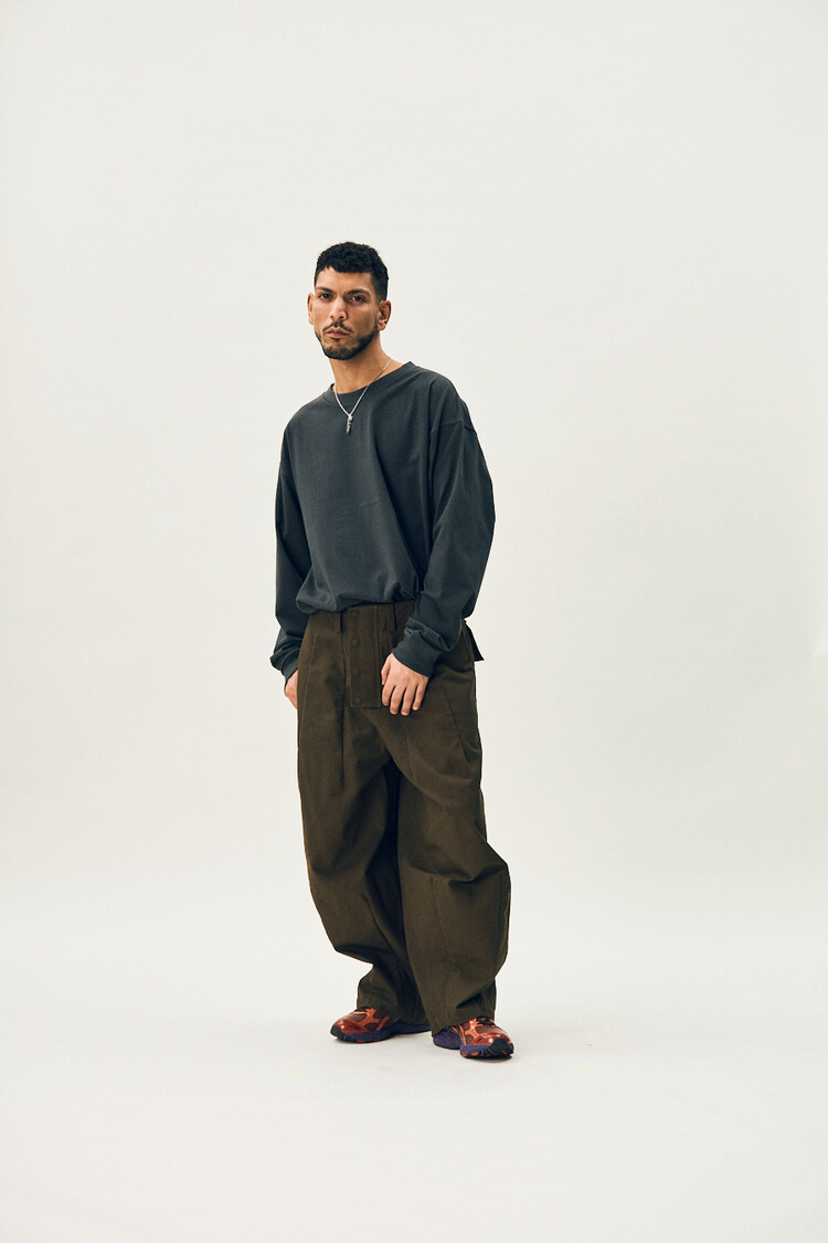 여유로운 실루엣을 달래듯 뒤 하단에 위치한 TONE ON TONE 컬러의 이니셜 로고 프린트가 미니멀한 형태로 자리하고 있습니다.
