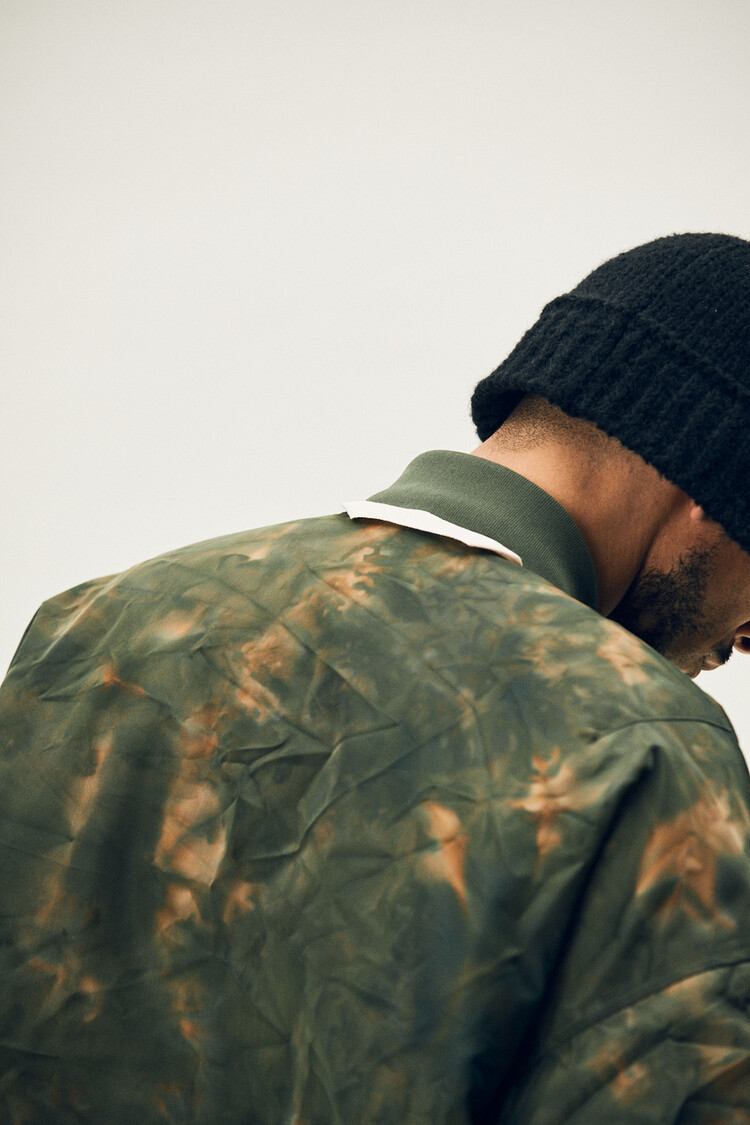 'HOKKOH' located in Osaka, Japan, is a processing company that produces handmade premium fabrics with precious passed-on know-how. This is 'MERELY PREMIUM MA-1 JUMPER', which was created through the process of handmade wrinkle work and vintage natural dyeing.